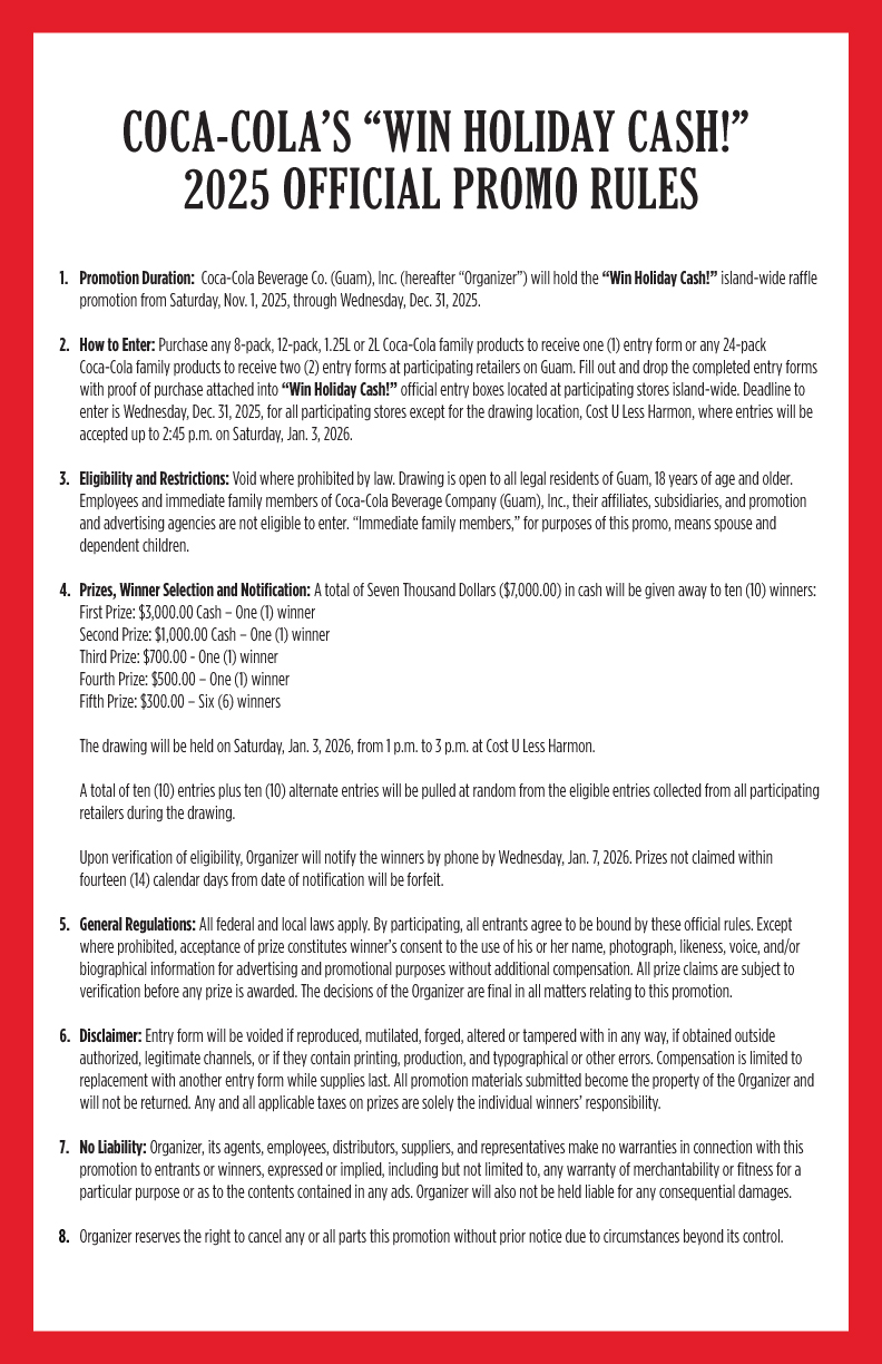 Receive entry form(s) for every purchase of any 8-pack, 12-pack, 24-pack, 1.25L or 2L Coca-Cola family products.